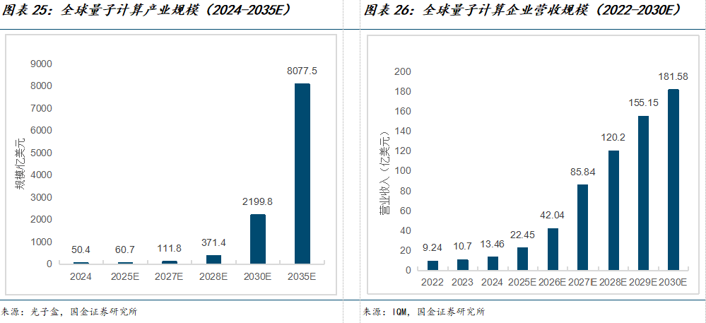 量子计算有望迎来爆发式增长,即将进入发展的黄金阶段。随着量子纠错技术的迭代优化和算法体系的不断完善,量子计算行业正从技术探索阶段快速向产业化应用过渡。从产业规模来看,根据光子盒统计,2024年全球量子计算市场规模突破50亿美元,预计2024至2030年将以87.64%的年均增长率(CAGR)保持高速增长,到2030年整体市场规模有望突破2000亿美元。从营收规模看,根据IQM统计,2024年全球量子计算企业的总营收规模达到13.46亿美元,未来5年CAGR有望达51.90%。