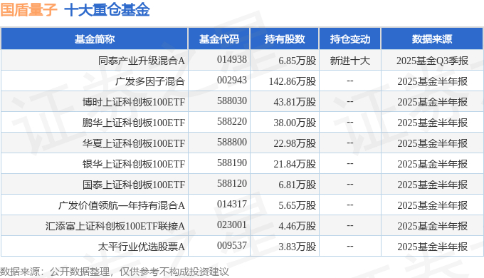 持有国盾量子最多的基金为同泰产业升级混合A,目前规模为1.78亿元,最新净值1.8958(10月17日),较上一交易日下跌4.15%,近一年下跌8.9%。该基金现任基金经理为王秀。