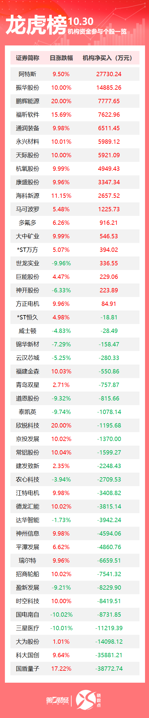 盘后数据显示,10月30日龙虎榜中,共45只个股出现了机构的身影,有18只股票呈现机构净买入,27只股票呈现机构净卖出。