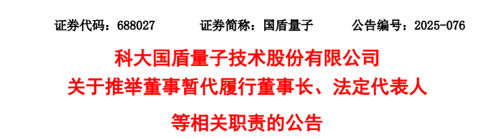 同日,国盾量子另行发布公告,称因公司董事长、法定代表人吕品离世,为保证公司相关工作顺利开展,全体董事共同推举董事应勇暂代履行董事长、法定代表人及战略与投资委员会主任委员、薪酬与考核委员会委员职责,直至公司完成董事补选及选举出新的董事长、相关专委会委员之日止。