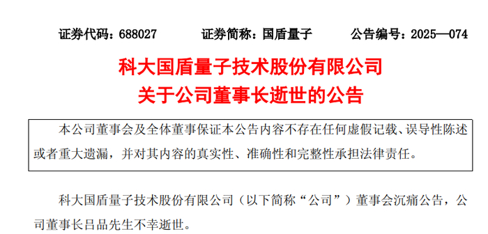 公告显示,科大国盾量子技术股份有限公司当日发布公告,宣布公司董事长吕品不幸逝世,公司及董事会对吕品逝世表示沉痛哀悼并向其家属表达深切慰问。