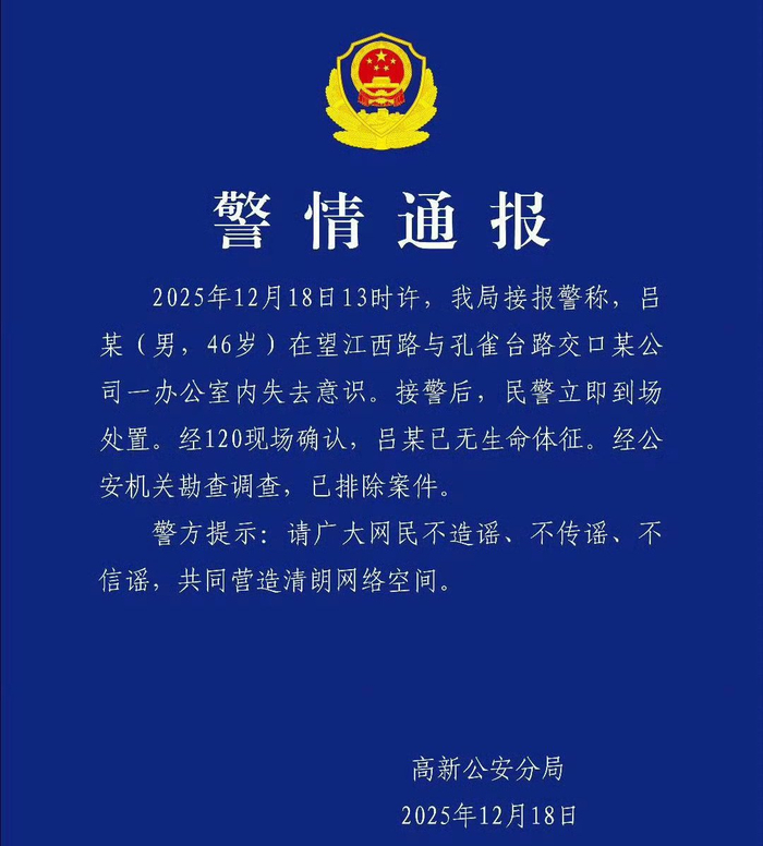 据媒体公开报道,12月18日晚,合肥市公安局高新技术开发区分局发布警情通报,18日13时许,我局接报警称,吕某(男,46岁)在望江西路与孔雀台路交口某公司一办公室内失去意识。接警后,民警立即到场处置。经120现场确认,吕某已无生命体征。经公安机关勘查调查,已排除案件。