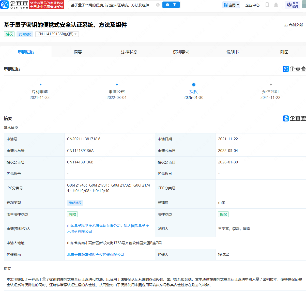 企查查APP显示,近日,国盾量子(688027.SH)申请的“基于量子密钥的便携式安全认证系统、方法及组件”专利获授权。
