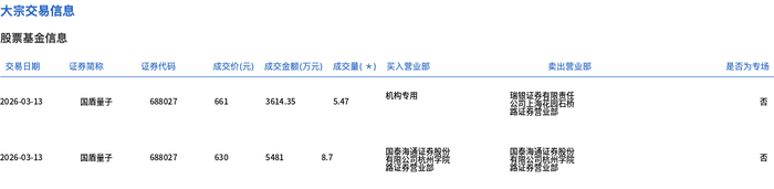 3月13日,国盾量子大宗交易成交14.17万股,成交额9095.35万元,占当日总成交额的3.04%,成交均价641.87元,较市场收盘价661元折价2.89%,其中最高成交价661元,最低成交价630元。