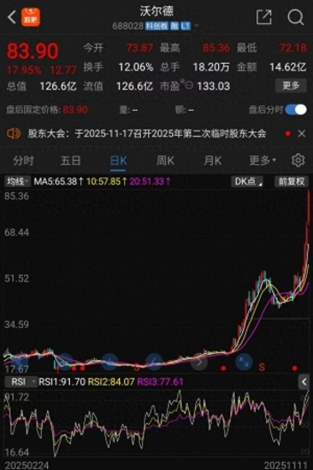 2025年11月以来,培育钻石板块迎来新一轮上涨行情,沃尔德作为核心标的表现尤为亮眼。行情方面,截至11月4日收盘,沃尔德的股价为49.03元/股,而到了11日收盘则攀升至83.90元/股,5个交易日内涨幅超过70%。其中11月6日单日涨幅11.22%,11月7日涨幅14.88%,11月10日涨幅9.80%,11月11日上涨17.95%。今年以来沃尔德股价已经强势上涨了285.02%。