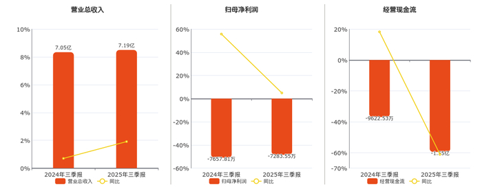 公司营业总收入为7.19亿元。归母净利润为-7283.55万元,在已披露的同业公司中排名第88。经营活动现金净流入为-1.55亿元,在已披露的同业公司中排名第85,较去年同报告期经营活动现金净流入减少5878.59万元。