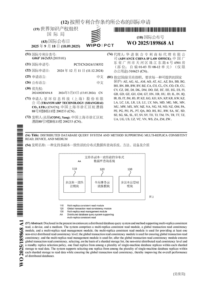星环科技公布国际专利申请:“一种支持多副本一致性读的分布式数据库查询系统、方法、设备及介质”