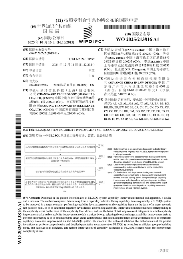 星环科技公布国际专利申请:“一种NL2SQL系统能力提升方法、装置、设备和介质”