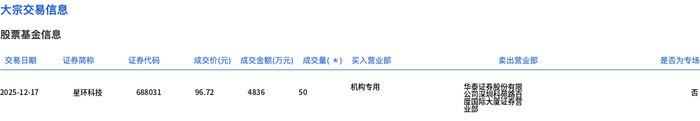 12月17日,星环科技大宗交易成交50万股,成交额4836万元,占当日总成交额的3%,成交价96.72元,较市场收盘价97.99元折价1.3%。