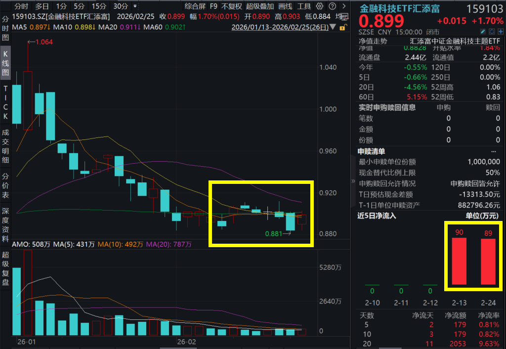 2月25日,A股市场延续开门红,两市超3700股上涨,截至15:00,“旗手2.0”金融科技ETF汇添富(159103)上涨1.7%,资金此连续涌入金融科技板块,金融科技ETF汇添富(159103)近2日连续吸金。