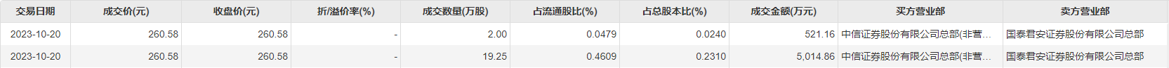 收涨2.71%,收盘价为260.58元,发生2笔大宗交易,合计成交量21.25万股,成交金额5536.02万元。