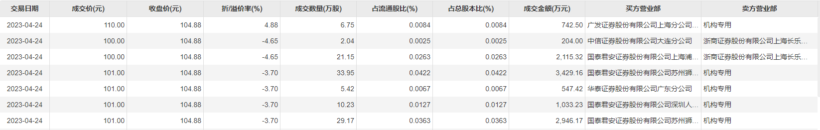传音控股4月24日大宗交易成交108.71万股,成交额1.1亿元,占当日总成交额的7.08%,成交均价101.35元,较市场收盘价104.88元折价3.37%,其中最高成交价110元,最低成交价100元。