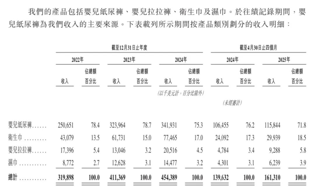 按产品划分,婴儿纸尿裤是公司绝对主力产品。2022年至2024年,婴儿纸尿裤销售收入从2.51亿美元增长至3.42亿美元,但占总收入比重从78.4%降至75.3%。2025年前四个月,这一比例进一步降至71.8%。