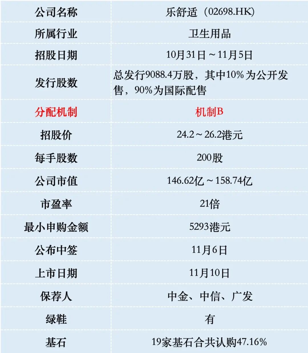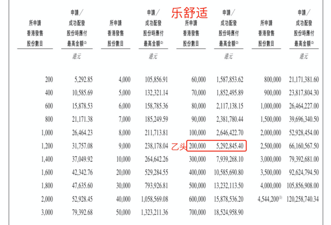 乐舒适目前孖展20倍,最终大概率会超购1500倍,甲乙组各22721手。按照25万人申购算,预估一手中签率3%,甲组全部抽签。