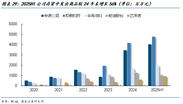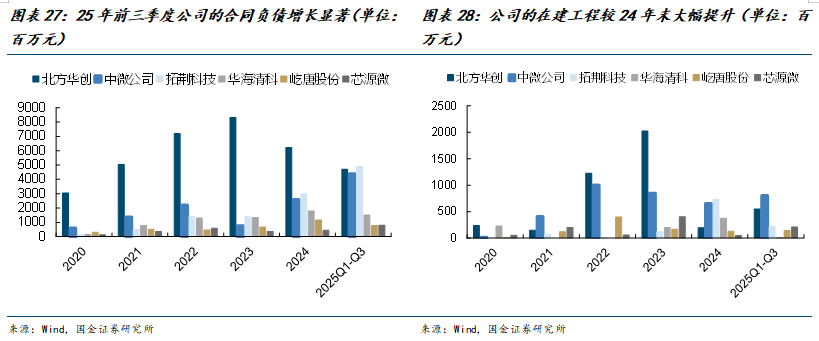 2025年前三季度,国内主要半导体设备公司的合同负债与在建工程出现分化。头部企业合同负债整体保持高位,中微公司、拓荆科技和公司的增长突出,25Q1-3公司的合同负债为8.0亿元,较24年末增长78.1%,北方华创因订单结构变化有所回落;在建工程方面北方华创、中微公司、屹唐股份与公司均实现扩张,截至25Q3,公司的在建工程为2.1亿元,较24年末的增幅达325.7%,反映了产能建设的持续推进。从存货的发出商品方面来看,除屹唐股份外,头部公司均呈现快速增长的趋势,25H1公司的发出商品为9.2亿元,较24年末增长了56.4%。