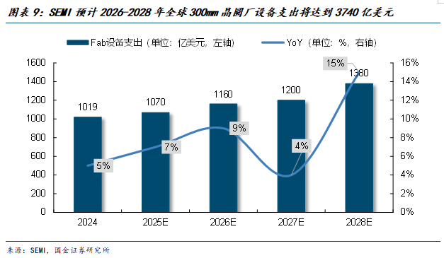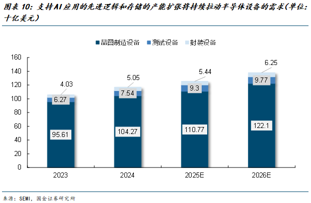 全球晶圆制造设备(WFE)市场景气度有望延续。根据SEMI的数据,2025年全球WFE市场规模将同比增长6.2%至1108亿美元,主要得益于代工及存储器相关设备需求超预期增长。展望2026年,WFE市场规模预计进一步提升至1221亿美元,同比增长10.2%。从驱动因素来看,半导体设备架构复杂度显著提升,以及人工智能与高带宽存储器(HBM)等高性能半导体需求快速增长,是推动设备持续扩张的核心动力。