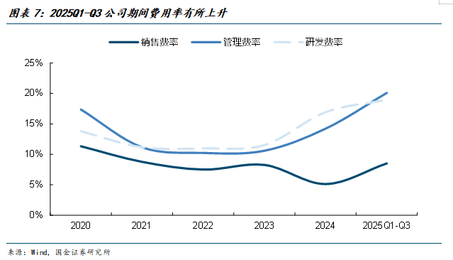 2025Q1-Q3公司期间费用率波动较大,盈利能力短期承压。25Q1-Q3公司的管理费用率攀升至20.10%,主要系公司员工人数增加、薪酬支出上升及股份支付分摊,叠加前三季度营收同比出现下降。25年前三季度的销售费用率从2024年的5.1%上升至8.5%,体现了公司在市场拓展、客户支持及订单交付服务方面投入持续加大。 公司重视研发投入,研发费用率逐年增长,2024年研发费率达16.9%,2025Q1-Q3进一步增至19.0%。