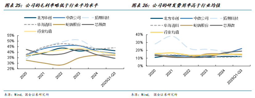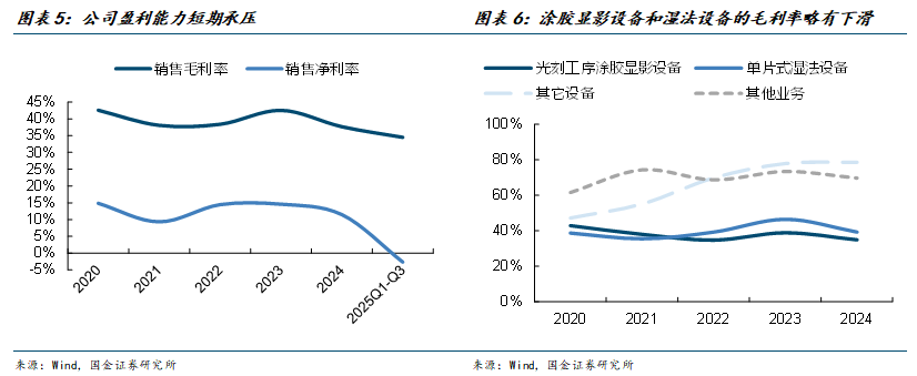 公司盈利能力短期承压,毛利率和净利率出现回落。2025年前三季度,公司销售毛利率为34.5%,销售净利率为-2.7%。业绩下滑主要系生产交付及验收周期延长影响,同时员工人数增长导致期间费用有所增加,以及政府补助减少等因素的影响。分产品来看,公司的光刻工序涂胶显影设备的毛利率低于单片式湿法设备,2024年的毛利率分别为34.8%和46.4%。