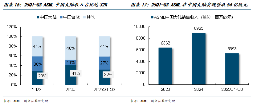 中国光刻机需求量较大,是ASML光刻机最大的客户。当前,中国大陆是最大的半导体设备市场,同时也是ASML的最大客户之一,2023年ASML在中国大陆实现营收64亿欧元,占比总营收比重为29%,2024年因晶圆厂扩产景气度及超额备货的因素影响,占比增长至41%,实现对中国大陆的销售额为89亿欧元,2025年Q1-Q3受出口管制等因素影响,中国大陆地区的收入比重下滑至32%,销售额为54亿欧元。展望未来,我们认为后续国内晶圆厂仍将继续扩产,国内对于光刻机需求仍然旺盛。Market.us预测到2034年,全球配套光刻的半导体Track设备市场规模将从2024年的36.3亿美元增长至69.4亿美元,2025年至2034年的复合增速(CAGR)为6.7%。