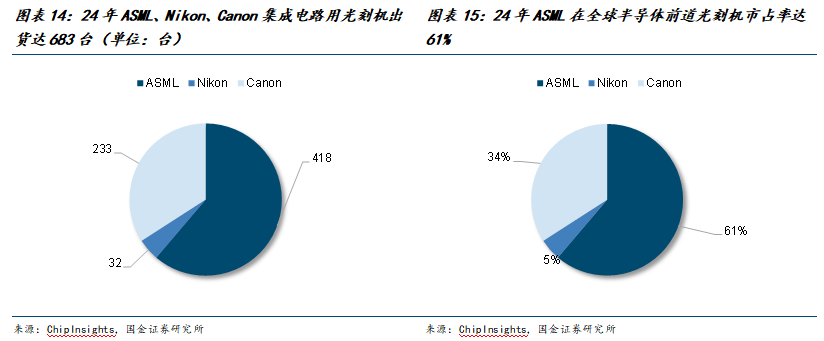 ASML主导全球前道高端光刻机市场。根据ChipInsights的2024年全球半导体前道光刻机销量数据显示,ASML作为行业龙头在EUV、ArFi等高端光刻机领域的销量明显高于其他两家。Nikon和Canon在KrF、i-line等领域占据相当程度的市场份额,Nikon除高端的EUV光刻机外,其他类型均有出货;而Canon则主攻低端的i-line和KrF光刻机,在i-line类型光刻机方面销售量较高。