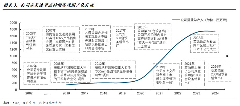 公司在关键节点持续实现国产化突破。2005年公司自研8英寸先进封装涂胶设备首次成功导入江阴长电,实现该领域凸点工艺设备的国产化突破;2007年完成12英寸先进封装涂胶/显影设备的量产交付;2012年承担国家02重大专项“300mm晶圆匀胶显影设备研发”;2013年先进封装喷胶设备实现批量出口台湾市场,标志着公司产品的国际化渗透迈出关键一步;2019年自主研发的前道用单片式清洗设备在中芯国际(深圳)通过工艺验证并实现销售,进一步进入头部晶圆厂验证体系。2019年12月,公司在上交所科创板上市,成为辽宁省首家科创板上市企业。
