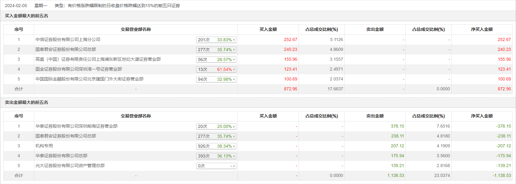 2月5日,中科通达今日跌停,全天换手率达8.17%,振幅达18.21%。龙虎榜数据显示,营业部席位合计净卖出265.57万元。其中,机构合计净卖出207.12万元。此外,华泰证券深圳前海证券营业部、国泰君安证券总部分别卖出378.15万元、238.11万元;中信证券上海分公司、国泰君安证券总部分别买入252.67万元、240.23万元。