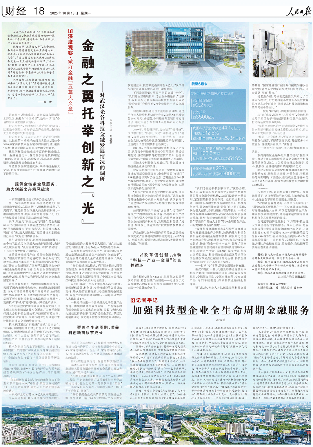 10月13日,《人民日报》“深度观察·做好金融‘五篇大文章’”系列调研报道首篇《金融之翼托举创新之光——对武汉光谷科技金融发展情况的调研》刊发,全面展现光谷以金融活水滋养科技创新的蓬勃图景。