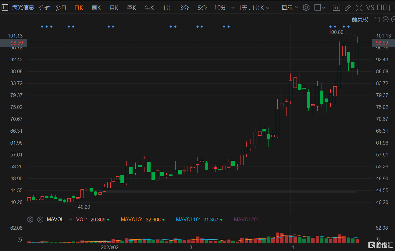 格隆汇4月25日丨算力概念股拉升,其中海光信息(688041.SH)盘中一度大涨超12%,股价首次站上百元大关,总市值市值更是高达2300亿元。ChatGPT带动AIGC快速发展,对算力芯片的需求剧增,民生证券看好公司在行业高速发展+国产替代双重因素促进下的增长前景,维持其“推荐”评级。有分析称,资金对海光信息热捧的态度,或是因为其产品广泛应用于计算密集类应用领域,这正好踩中了当前人工智能的风口。