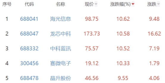 其中,海光信息、龙芯中科、中科蓝讯、赛微电子、晶升股份位列板块涨幅前五位,涨幅分别为10.62%、10.58%、10.52%、10.33%、9.55%。