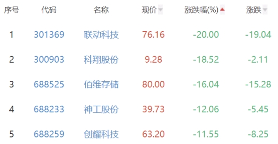 联动科技、科翔股份、佰维存储、神工股份、创耀科技位列涨幅榜后五位,涨幅分别为-20.00%、-18.52%、-16.04%、-12.06%、-11.55%。