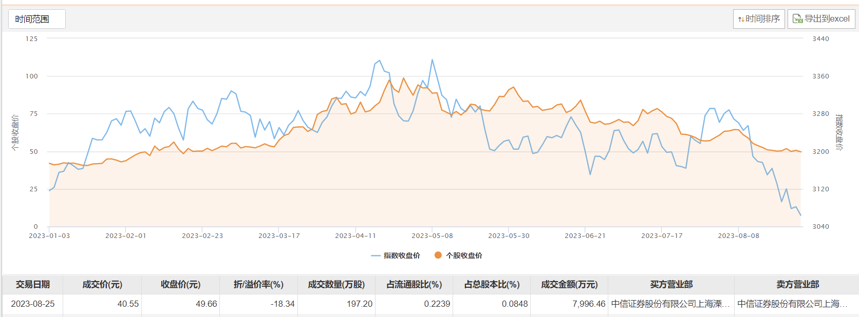 8月25日大宗交易成交197.2万股,成交额7996.46万元,占当日总成交额的10.12%,成交价40.55元,较市场收盘价49.66元折价18.34%。