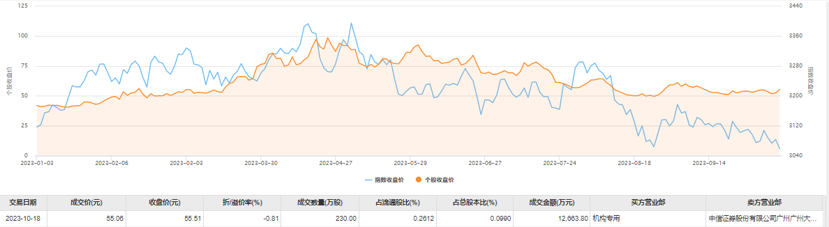 今日大宗交易成交230万股,成交额1.27亿元,占当日总成交额的4.4%,成交价55.06元,较市场收盘价折价0.81%。