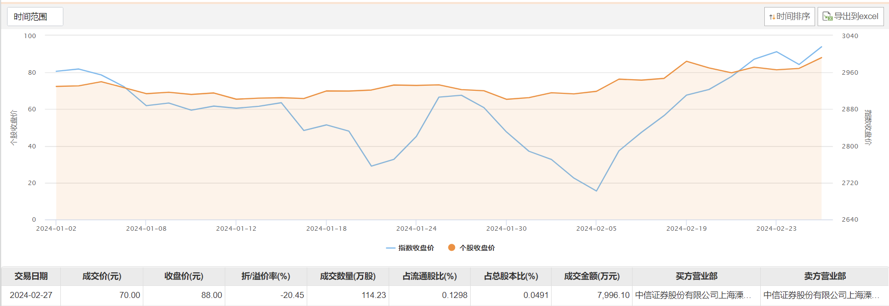 大宗交易成交114.23万股,成交额7996.1万元,占当日总成交额的2.41%,成交价70元,较市场收盘价88元折价20.45%。
