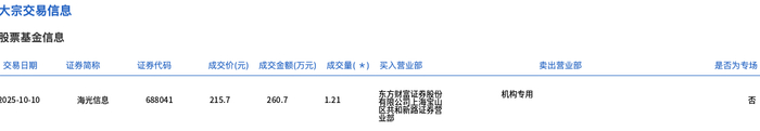 10月10日,海光信息大宗交易成交1.21万股,成交额260.7万元,占当日总成交额的0.02%,成交价215.7元,较市场收盘价241.49元折价10.68%。