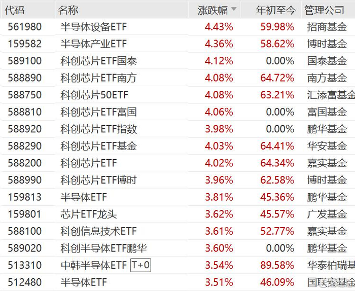 芯片股拉升,寒武纪、海光信息涨超7%,半导体设备ETF、半导体产业ETF、科创芯片ETF南方、科创芯片50ETF、科创芯片ETF富国涨超4%;科创芯片ETF博时、科创芯片ETF、科创芯片ETF指数、半导体ETF、芯片ETF龙头、中韩半导体ETF、芯片ETF涨超3.5%。