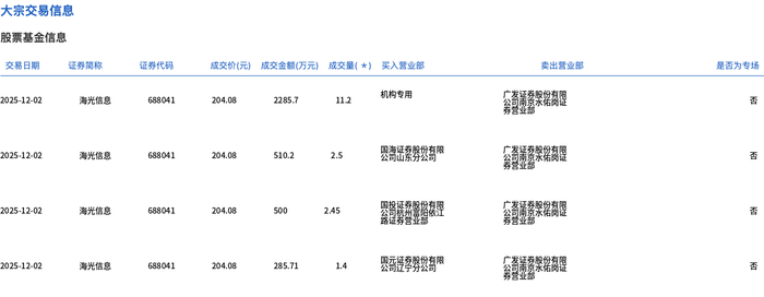 12月2日,海光信息大宗交易成交17.55万股,成交额3581.61万元,占当日总成交额的1.37%,成交价204.08元,较市场收盘价212.58元折价4%。