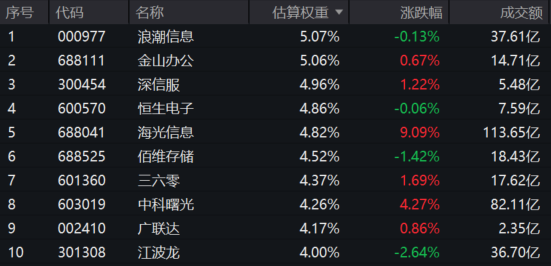 信创50ETF(560850)标的指数权重股多数飘红:海光信息涨超9%,中科曙光涨超4%,深信服、三六零涨超1%,金山办公、广联达微涨。