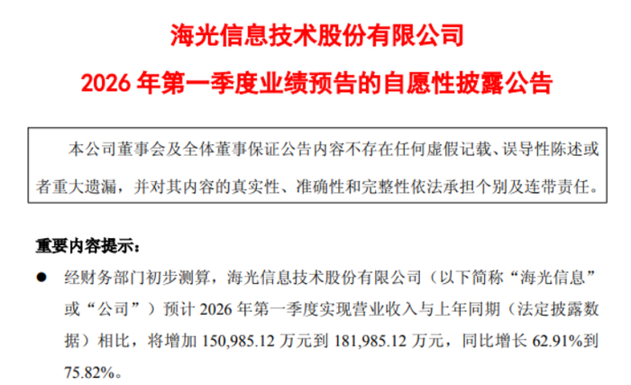 2026年第一季度,海光信息预计实现营业收入391,000.00 万 元到 422,000.00 万元,,同比增长 62.91%到 75.82%;预计实现归属于母公司所有者的净利润 62,000.00 万元 到 72,000.00 万元,同比增长 22.56%到 42.32%。扣除股份支付的影响后,预计 2026 年第一季度实现归属于母公司所有者的净利润 86,000.00 万元到 96,000.00 万元,同 比增长 62.95%到 81.89%。