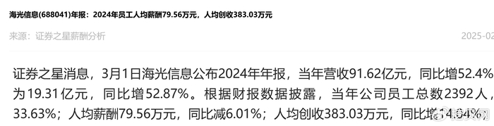 另据证券之星数据,2024年海光信息员工总数2392人,同比增33.63%;人均薪酬79.56万元,同比减6.01%;人均创收383.03万元,同比增14.04%。