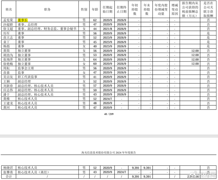 2024年,海光信息董监高薪酬共计2952.56万元。但值得注意的是,海光信息并没有公布董监高人员的具体薪酬,仅公布了4位独董的薪酬,均为12万元。
