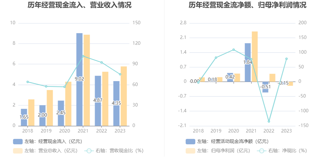 2023年,公司经营活动现金流净额为-1497.15万元,同比增加3638.61万元;筹资活动现金流净额-2086.75万元,同比减少8.72亿元;投资活动现金流净额3.08亿元,上年同期为-6.23亿元。