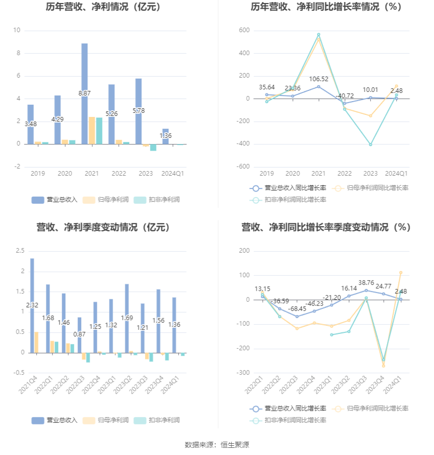 2024年第一季度,公司毛利率为26.59%,同比上升4.15个百分点;净利率为-2.68%,较上年同期上升1.32个百分点。