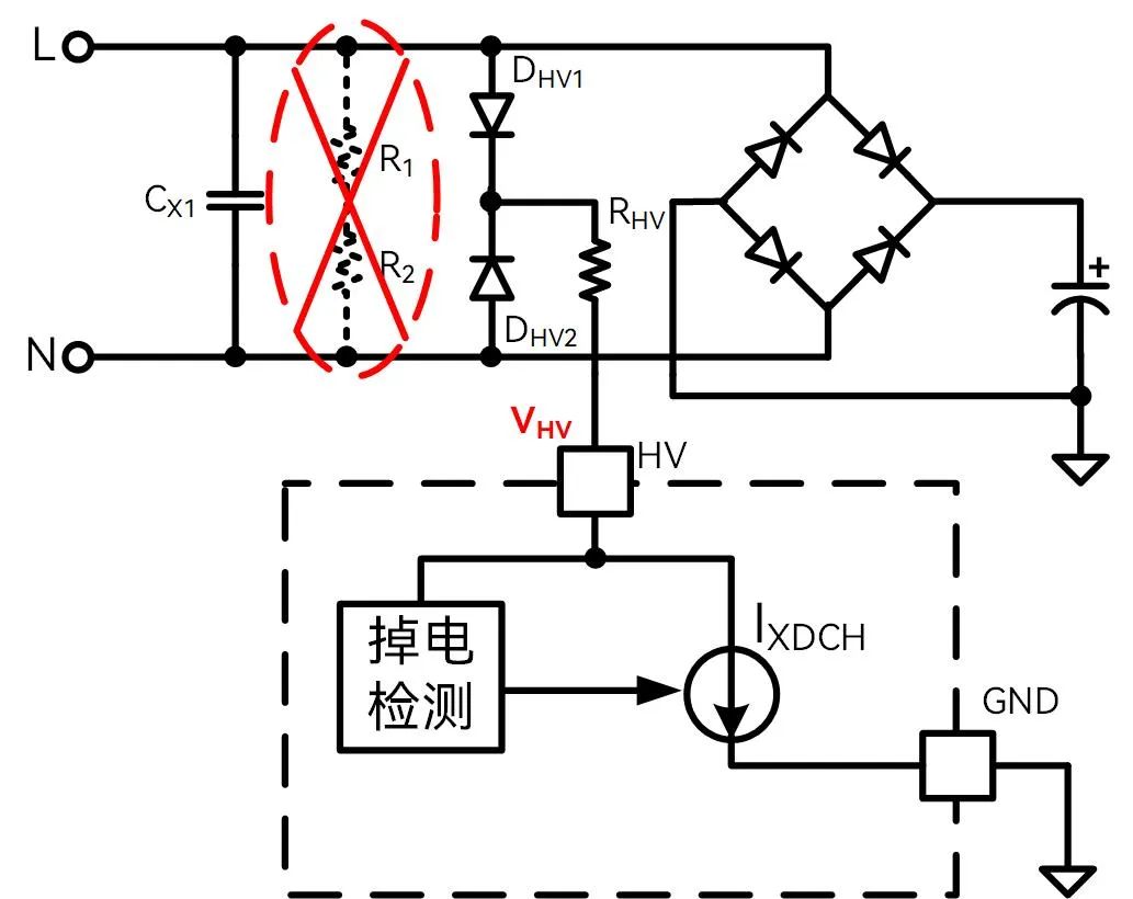 为了防止用户在拔下电源时意外触碰交流输入端子而导致被电击,需要在 CX1 电容上并联放电电阻(R1、R2)。但放电电阻的存在会增加系统待机功耗。芯片集成了输入掉电检测和 X 电容放电功能,可以省去放电电阻,并有效降低待机功耗。同时 HV 管脚具备了交流输入欠压的保护功能。