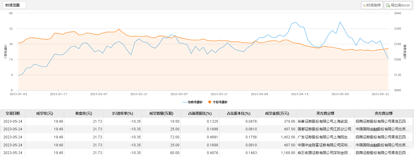 5月24日大宗交易成交201.5万股,成交额3925.22万元,占当日总成交额的46.53%,成交价19.48元,较市场收盘价21.73元折价10.35%。