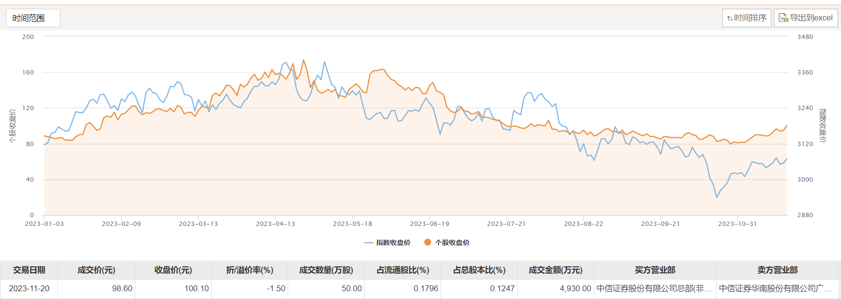 今日大宗交易成交50万股,成交额4930万元,占当日总成交额的5.86%,成交价98.6元,较市场收盘价折价1.5%。
