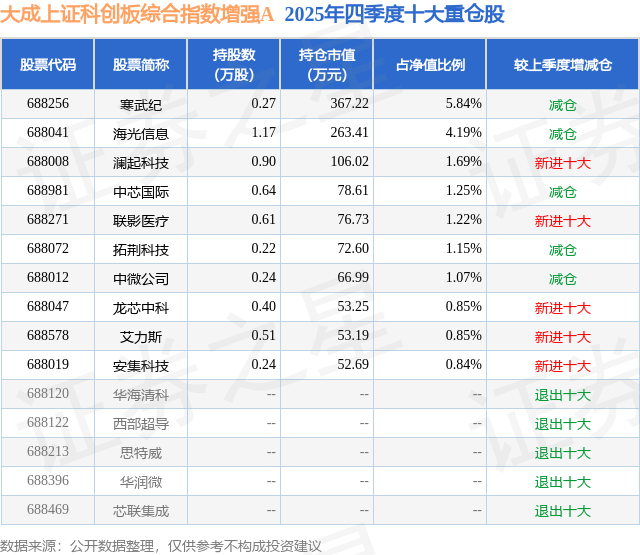 根据2025基金年报公募基金重仓股数据,重仓该股的公募基金共1家,其中持有数量最多的公募基金为大成基金的大成上证科创板综合指数增强A。大成上证科创板综合指数增强A目前规模为0.39亿元,最新净值1.4548(3月13日),较上一交易日下跌0.97%。该公募基金现任基金经理为夏高 刘旺。夏高在任的基金产品包括:大成360互联网+大数据100A,管理时间为2016年2月3日至今,期间收益率为256.88%;大成沪深300增强发起式A,管理时间为2021年2月23日至今,期间收益率为0.36%;大成动态量化配置策略混合A,管理时间为2023年4月14日至今,期间收益率为27.64%;大成中证500指数增强A,管理时间为2024年7月19日至今,期间收益率为66.34%。刘旺在任的基金产品包括:大成沪深300增强发起式A,管理时间为2024年1月2日至今,期间收益率为40.84%;大成中证1000指数增强发起式A,管理时间为2024年11月15日至今,期间收益率为47.07%;大成智惠量化多策略混合A,管理时间为2025年12月4日至今,期间收益率为9.54%。