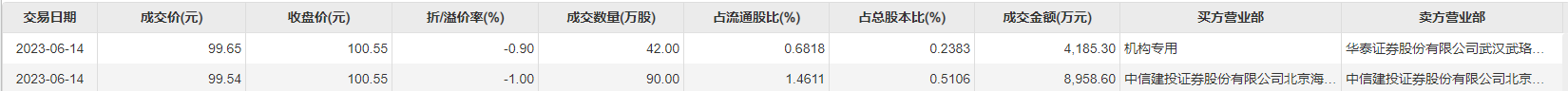 长光华芯6月14日大宗交易成交132万股,成交额1.31亿元,占当日总成交额的12.46%,成交均价99.58元,较市场收盘价100.55元折价0.96%,其中最高成交价99.65元,最低成交价99.54元。
