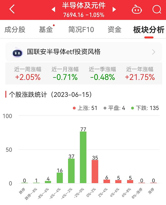 中国经济网北京6月15日讯 今日,半导体及元件板块整体跌幅1.05%,其中,51只股票上涨,4只股票平盘,135只股票下跌。