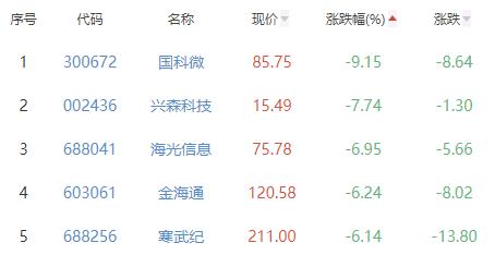 国科微、兴森科技、海光信息、金海通、寒武纪位列涨幅榜后五位,涨幅分别为-9.15%、-7.74%、-6.95%、-6.24%、-6.14%。