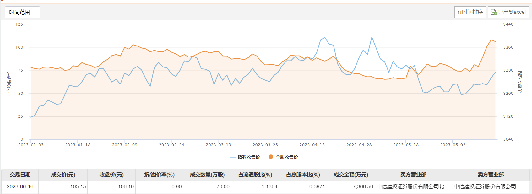 今日大宗交易成交70万股,成交额7360.5万元,占当日总成交额的5.49%,成交价105.15元,较市场收盘价折价0.9%。